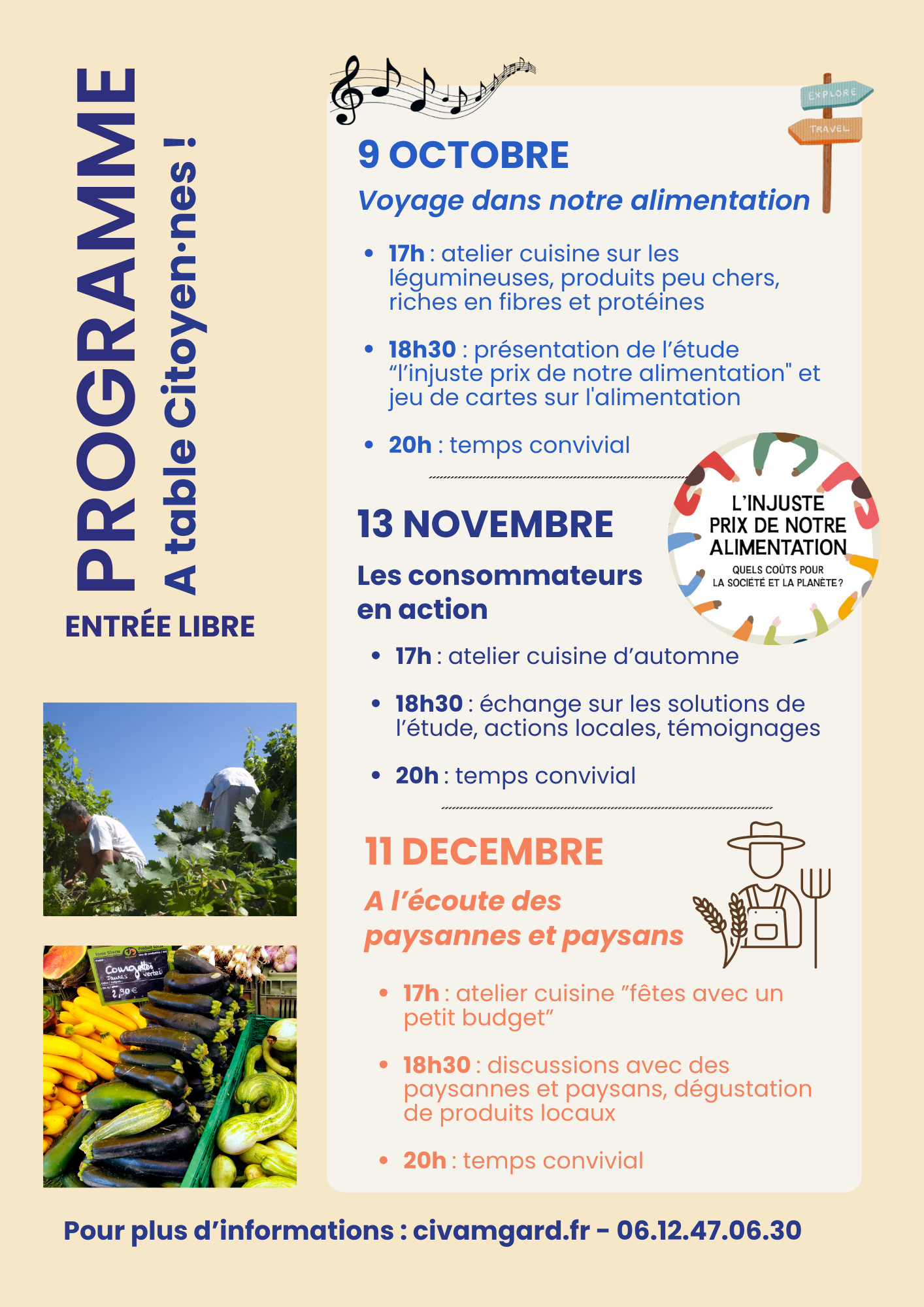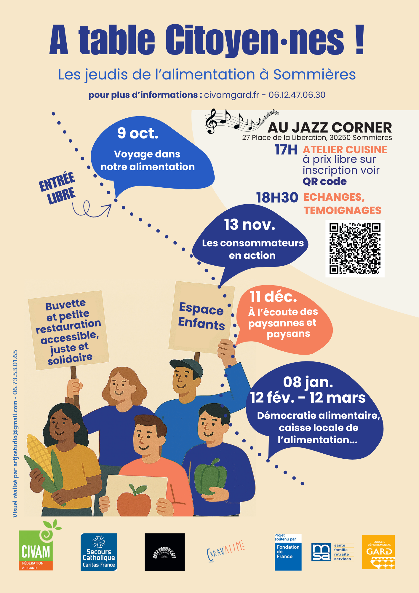 D’octobre à mars, le CIVAM du Gard et le Secours Catholique organisent tous les deuxièmes jeudis du mois des ateliers sur le thème de l’alimentation au Jazz Corner Café à Sommières. Ces ateliers seront divisés en trois temps avec possibilité de participer à une ou plusieurs activités :